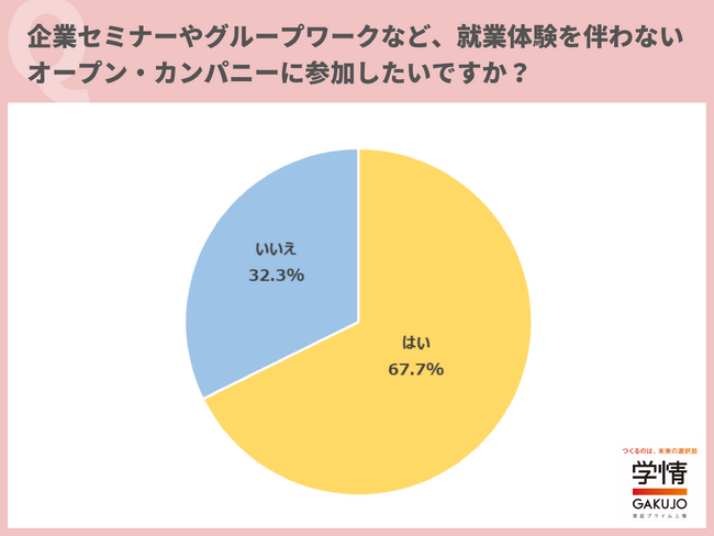 「企業セミナーやグループワークなどオープン・カンパニーに参加したい」とした学生が67.7%に上りました。「業界研究や仕事研究のために参加したい」「まずはセミナーやワークを通じて、業界や企業のことを知りたい」「オープン・カンパニーに参加して、興味を持った企業の就業体験に参加したい」などの声が寄せられました。