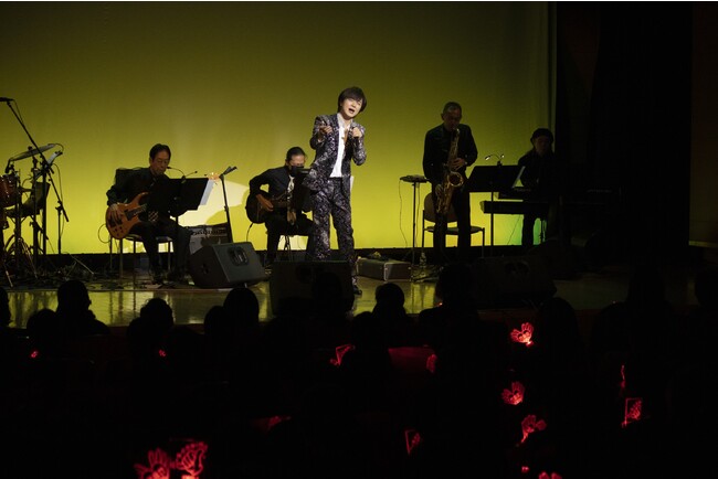 『あなたのブルース』を披露した後、バンド演奏で会場の雰囲気も温かくなったところで後半は黒いシャツとパンツに白いロングジャケットを纏い竹島が登場。ファンが持参したうちわやボードのメッセージを読み、ファンとのささやかな時間を過ごした。『表参道午前二時』『おんな占い』『おまえに』そして『献身』と大人なナンバーが続くと「今日のひとときが皆様の思い出となりますように。この曲は隼さんのサックスでないと歌えない曲です。サックスの音色と共に歌わせてください」と語り『黒い花びら』を披露。静寂に包まれた会場に、竹島の歌声が大きく響き渡り、涙するファンも。