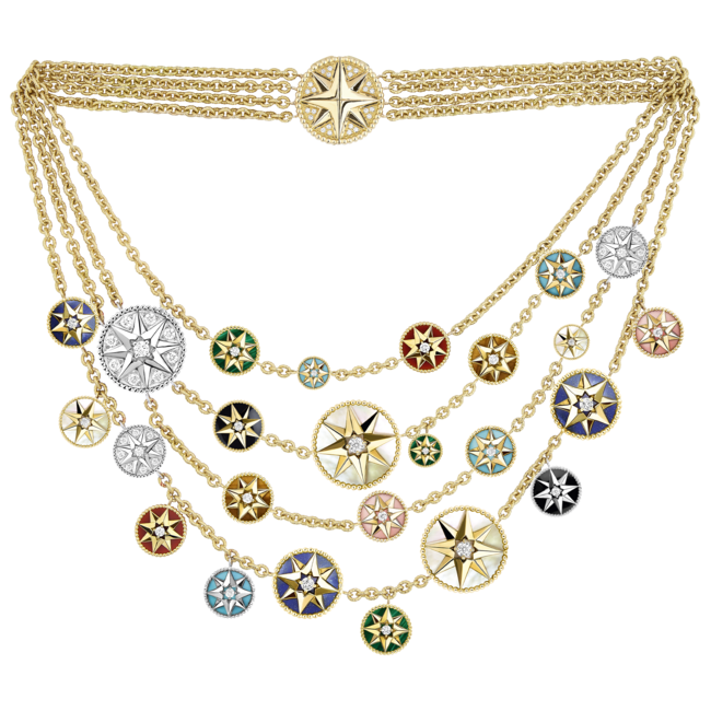 ショーに出席した俳優のカミーユ・コッタンは、白いチュールシャツにマルチカラーのパッチワークパンツを合わせた装いで登場。胸元には、イエローゴールド、ピンクゴールド、ホワイトゴールドに、ダイヤモンド、マザーオブパール、ラピスラズリ、マラカイト、ターコイズ、オニキス、タイガーアイ、カーネリアン、ピンクオパールをあしらった「ローズ デ ヴァン」のネックレスが燦然と輝きました。