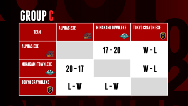 TOKYO CRAYON.EXEが出場辞退となったため、文字通り1発勝負となったグループC。ALPHAS.EXEはマルコ(#16)を中心に外角から、MINAKAMI TOWN.EXEは強気なペイントアタックで得点を積み重ねるが、互いに譲らずシーソーゲームの展開。残り1分を切ってもなお同点だったが、MINAKAMI TOWN.EXEがディフェンスでも意地を見せTOを誘発。ここから流れをつかみ、最終スコア20-17でMINAKAMI TOWN.EXEが勝利。決勝の舞台へコマを進めた。
