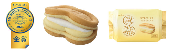 この度、レギュラーフレーバーの「スフレワッフル(ホイップ&カスタード)」が、その味と品質を認められ、2023年度モンドセレクションで金賞を受賞。その製法技術、素材が「スフレワッフル(つぶあん&ホイップ)」にも活かされています。