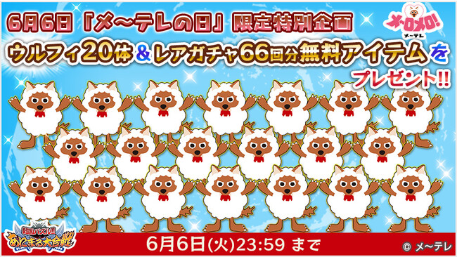 メ〜テレ(名古屋テレビ放送)は、局のマスコットキャラクター「ウルフィ」の登場20周年を記念し、スマートフォン向け人気ゲームアプリ「戦国パズル!!あにまる大合戦」内で、アプリを開発した株式会社ラクジン(大阪市)によるコラボイベントに参加します。ユーザーを喜ばせたい!癒したい!という両社の共通の願いから実現しました。
