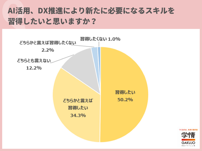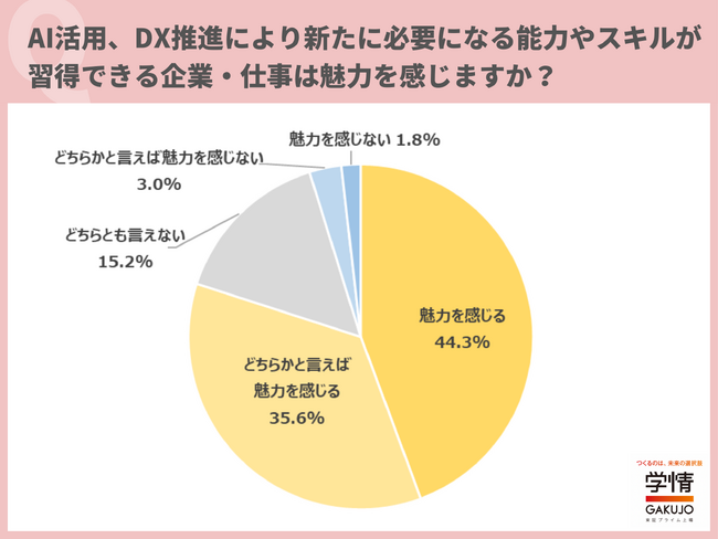 株式会社学情(本社:東京都千代田区)は、20代の仕事観や働く意識をひも解くために、アンケート調査を実施しました。今回は、「AI・DXスキルの習得」に関して調査。AI・DX関連スキルを「習得したい」と回答した20代が、8割を超えました。「キャリアの幅が広がり、転職もしやすいと思う」「時代の変化に応じて必要とされる知識を身に付けたい」「AIやDXでできることを理解しておきたい」といった声が寄せられています。また、AI・DX関連スキルを習得できる企業・仕事について、「魅力を感じる」と回答した20代も8割に迫りました。「仕事を通して、AIやDX関連の実践的なスキルを身に付けたい」「AI活用やDX推進に取り組む企業は、企業としての成長力も高いと思う」といった声が上がりました。