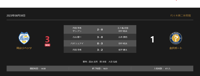 ノジマTリーグ 2023-2024シーズン 公式戦 8月30日開催 岡山リベッツ vs 金沢ポート 対戦結果