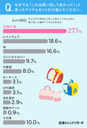 日本トレンドリサーチ(運営会社:株式会社NEXER)は、ランドセル専門メーカー「ララちゃんランドセル」と共同で「小学校入学後に買い足したもの」に関するアンケートを実施し、結果をサイト内にて公開したので紹介します。