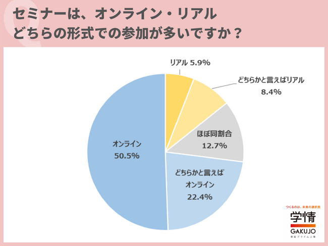 セミナーの参加形式について、「オンラインでの参加が多い」とした学生が50.5%に上りました。「どちらかと言えばオンライン」22.4%を合わせると、7割以上の学生が、セミナーはオンラインでの参加が多いとしています。
