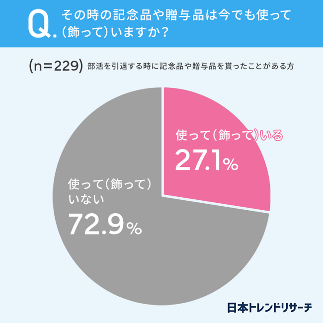 27.1%の方が、部活の引退時にもらった贈与品を「まだ使っている(飾っている)」と回答しています。
