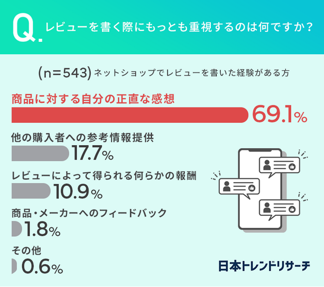 また商品のレビューを書いたことのある69.1%の方が「商品に対する自分の正直な感想」をもっとも重視している、と回答しています。