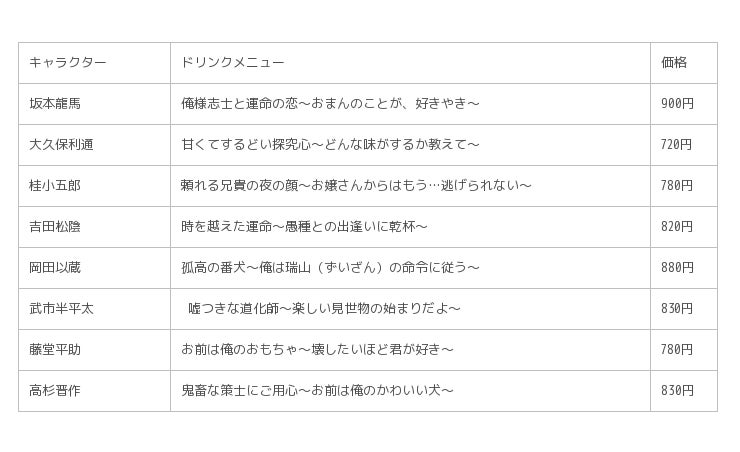 歴史を動かす俺様志士・坂本龍馬、鬼の新撰組副長・土方歳三、美しき次期将軍候補・徳川慶喜など、『イケメン幕末◆運命の恋』のキャラクターや4つの勢力をモチーフとしたオリジナルコラボメニューが期間限定で登場します。ドリンク17種類、フードメニュー10種類の全27種類のメニューをお楽しみいただけます。