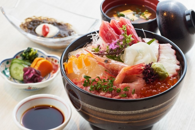 ランチタイムでは,新たに『オーストラリア産サーロインステーキと彩り野菜』(¥2,380)のほか、和食のメニューとしてボリュームたっぷりのどんぶりに小鉢、香の物、赤だしの味噌椀がついた『天丼御膳』(¥2,880)と『海鮮丼御膳』(¥3,180)をご用意いたします。