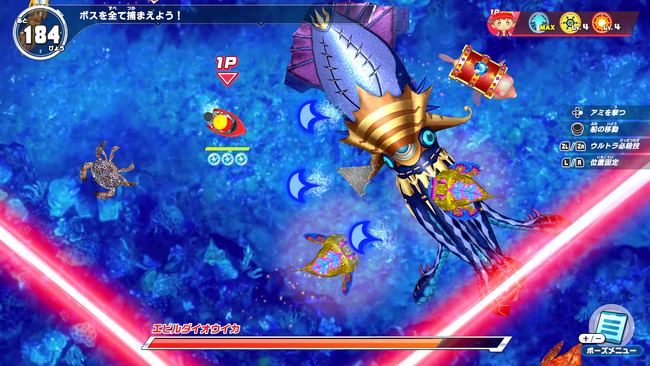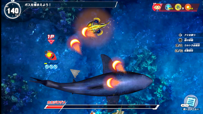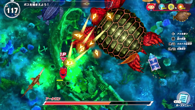 魚たちの捕獲では、回復アイテムや強化アイテムがドロップすることもあります。魚や攻撃にぶつかると受けるダメージを回避しながら強化を行い、最終ボスの捕獲を目指しましょう。