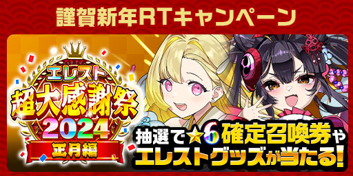 エレメンタルストーリー公式Twitter(@elementalstory)をフォロー、1月1日(月) 18:00にツイートされた該当のツイートをRTすることで、抽選で各5名様に「未所持★6確定召喚券」もしくはエレストのグッズが入った「エレストリアルグッズ福袋」をプレゼントいたします。