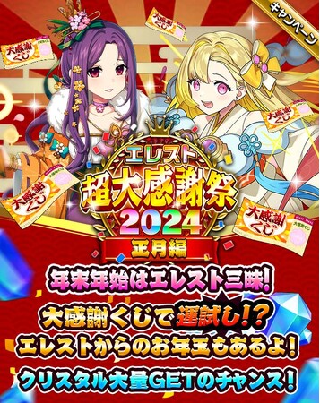 2023年もエレストを遊んでくれたみなさまに感謝の気持ちを込めて!クリスタルが最大で3,000個当たる大感謝くじの開催が決定!無料召喚など内容盛り沢山な『超大感謝祭2024 正月編』にご期待ください!