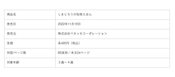 株式会社ベネッセコーポレーション(本社:岡山県岡山市、代表取締役社長:小林 仁、以下ベネッセ)の提供する、幼児の学習・成長支援ブランド<こどもちゃれんじ>は、「しまじろうの知育えほん」を創刊しました。2歳以上のお子さまを対象に、ぬりえ・めいろ・おえかき・こうさくをテーマにした全4冊のシリーズ展開で、11月18日よりYahoo!やAmazon等のインターネット・一部専門店にて順次販売します。手や指を動かしながら、文字を書くための基本動作や論理、図形、社会生活について楽しく学べます。