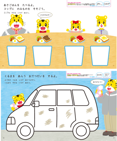 特長:クレヨンを動かす(運筆)練習から、クレヨンで塗る練習へとステップアップしながら学べます。「しまじろうの一日」をテーマにしたストーリー展開の中で、挨拶や生活習慣についても確認できます。