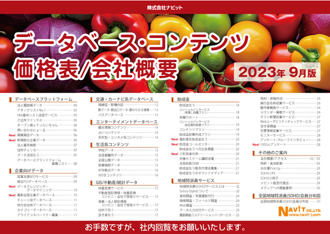 この度、2023年度9月版ナビットデータベース・コンテンツ価格表/会社概要が完成しましたのでお知らせいたします。
