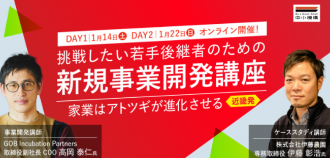 中小機構(独立行政法人中小企業基盤整備機構)近畿本部は、経営後継者が行う新事業開発、新分野進出等の取組みを後押しするために「新事業開発講座」を、2023年1月14日(土曜)、2023年1月22日(日曜)にオンラインにて開催します。また、経営後継者に対する支援について支援者向けのリアルイベントも2023年1月27日(金曜)に開催します。