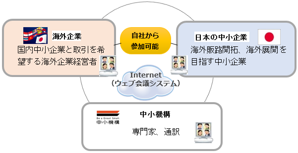中小機構では、国内中小企業との連携を希望する海外企業経営者(CEO等)と海外展開を目指す日本の中小企業者とのマッチングを2012年度から実施しています。経営者同士で直接商談できることが最大の特徴で、通訳を配置し、国内にいながら、信頼のおける海外ローカルパートナー企業※と出会うことができる機会を提供します。