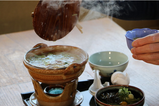 さらに料理旅館に移動しお昼ごはん。ここでは珍しい鰻の雑炊、さらに自家製の生めんを使った茶そばを味わいます。