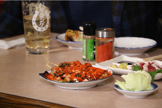 熊本出身のご夫婦が営む大衆酒場で、馬刺しの希少部位「フタエゴ」や「ポテサラちくわ」などの熊本名物、さらに真っ赤になるほど唐辛子と秘伝のスパイスをかけたやきとりをいただきます。