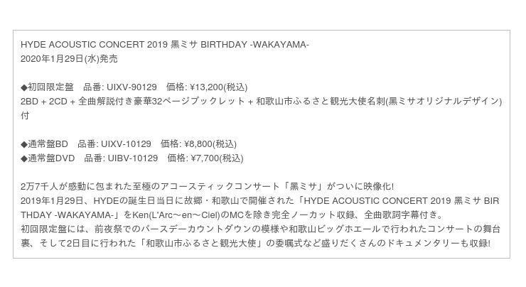 ※1月29日(水)発売予定の「HYDE ACOUSTIC CONCERT 2019 黒ミサ BIRTHDAY -WAKAYAMA-」