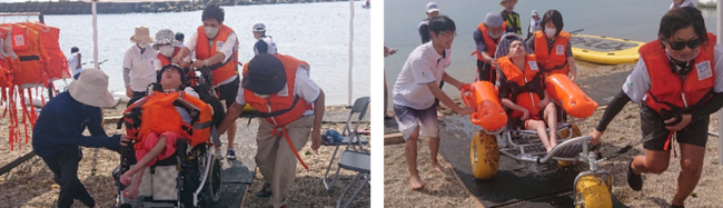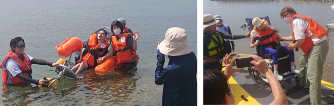濡れるのを嫌がってた障がい者の方も水陸両用車いすに乗り換え、海にザブ〜ン!(写真左)
