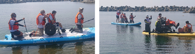 好天に恵まれたマリンパークねずがせきで、障がい者とご家族、職員の皆さんがマリンアクティビティを楽しみました。車いすのままビッグサップに乗船し海と潮風を満喫!