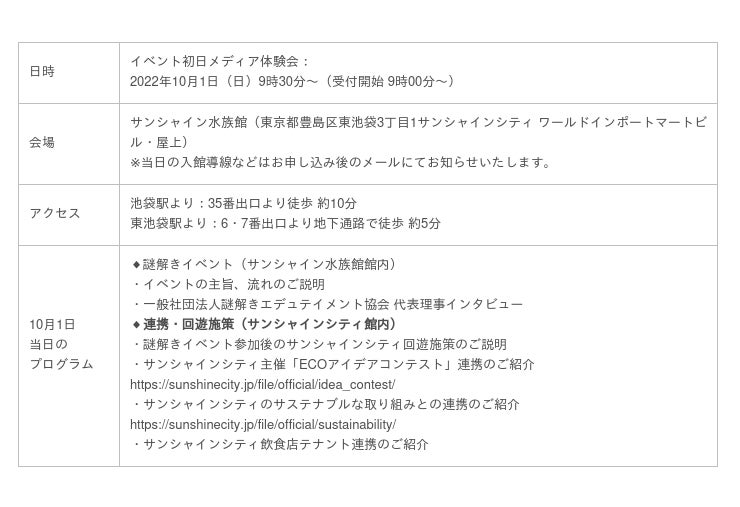 また、サンシャインシティが例年実施しているサステナブルなアイデアコンテスト「ECOアイデアコンテスト」(主催・株式会社サンシャインシティ)とも連携し、特別賞として「海なぞ賞」を設けることで本謎解きイベントで学んだ知識や発見を活かして同コンテストへの応募を促進しています。