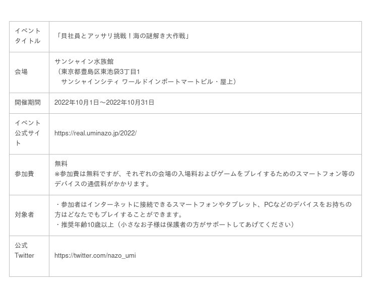 一般社団法人謎解きエデュテイメント協会は、2022年10月1日に、サンシャイン水族館(東京都)にて、全国3箇所の水族館で開催されているリアル謎解きイベント「貝社員とアッサリ挑戦!海の謎解き大作戦」の第3弾を開催いたします。