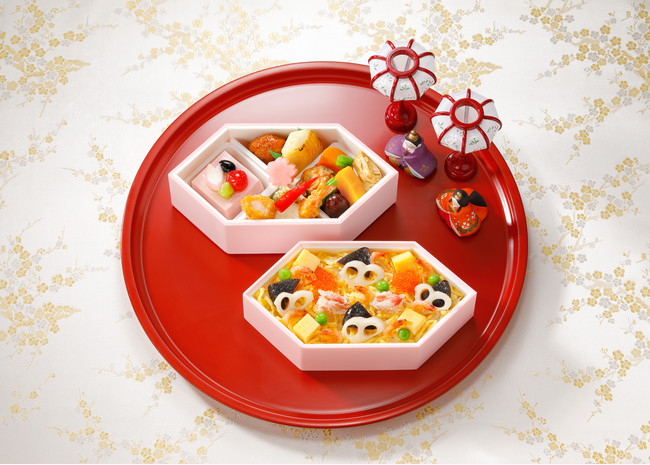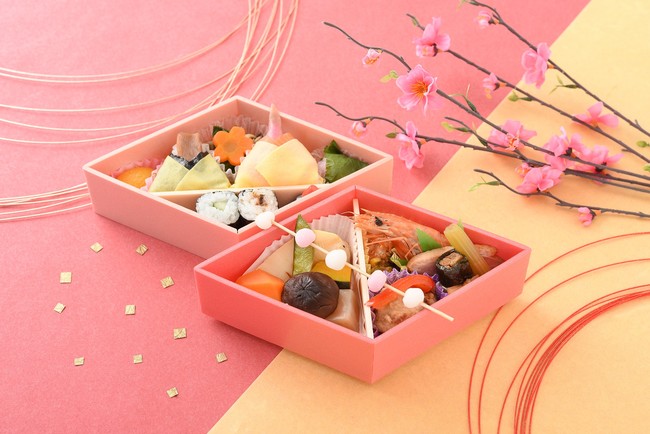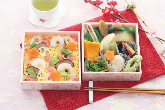 ちらしの具やおかずに縁起物やひな祭りにゆかりのあるものを集めた特別なお弁当。