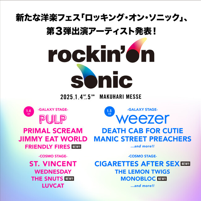 rockin'on sonic の第3弾追加アーティストとして1/4(土)出演の THE SNUTS と共に発表されたのは、昨年デビュー作が15 周年を迎えた踊れるロックの最終兵器 FRIENDLY FIRES。1/5(日)には欧米ではアリーナ級の会場をソールドアウトにするドリーム・ポップ・バンド CIGARETTES AFTER SEX、そしてロッキング・オンとクリエイティブマンがプッシュするニューヨークの新星MONOBLOCが追加となった。チケットは現在各プレイガイドにて発売中。