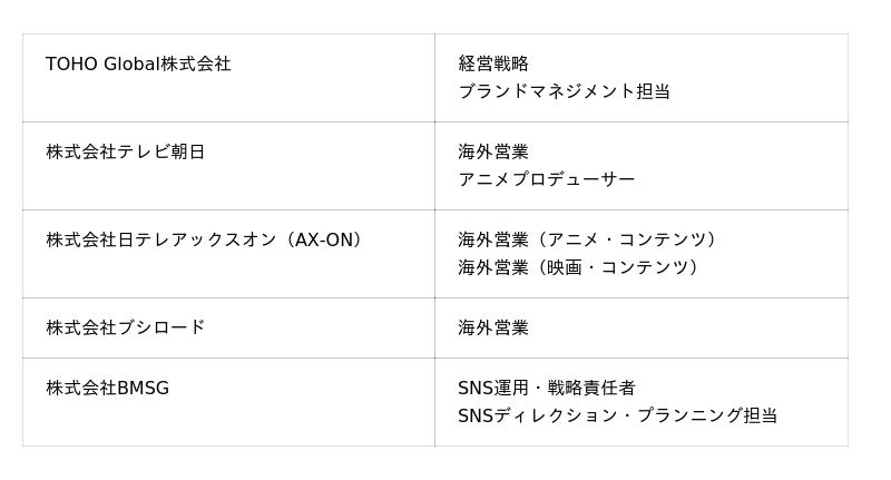 今回公募するのは、日本のエンターテインメント業界を牽引する5社。海外営業のほか、経営戦略やSNS運用担当など、各社の海外展開を支える多様なポジションで公募を行ないます。いずれも、映画、ゲーム、アニメ、ドラマ、音楽など、各社が持つ強力なIPと事業基盤を武器に、世界という広大なマーケットの開拓に挑むことができるポジションです。日本が誇るエンターテインメントで世界に挑む。そんな志ある方からのご応募をお待ちしています。
