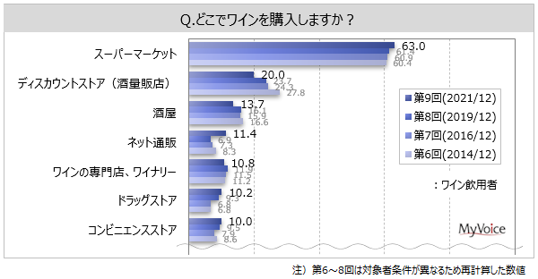 【ワインに関する調査】よく飲むワインの種類は「スパークリングワイン」が増加傾向、女性で比率高い。ワイン飲用者の購入場所は「スーパーマーケット」が6割強、「ディスカウントストア」が2割