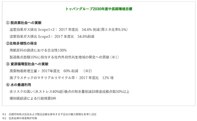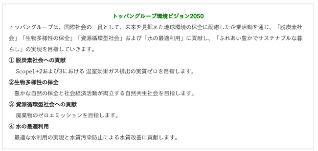 「トッパングループ環境ビジョン2050」に「Scope3での温室効果ガス排出実質ゼロ」「生物多様性の保全」を新たに追加、中長期環境目標も上方修正