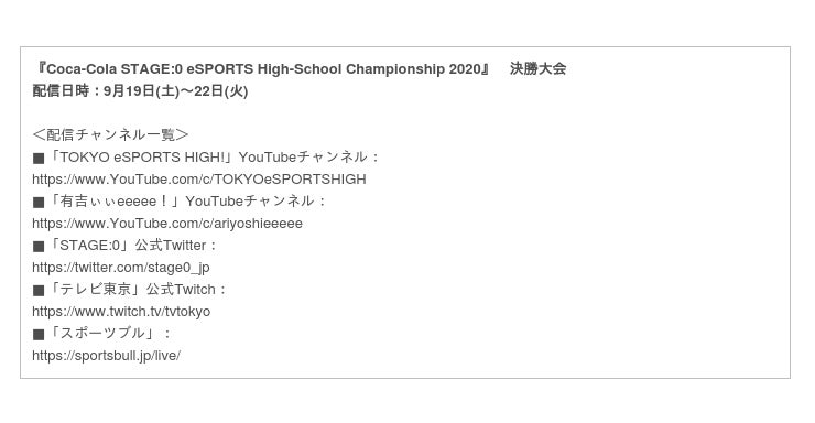 株式会社テレビ東京(本社:東京都港区、社長:石川一郎)、株式会社電通(本社:東京都港区、社長:五十嵐 博)が開催する、高校対抗のeスポーツ全国大会『Coca-Cola STAGE:0 eSPORTS High-School Championship 2020(読み:コカ・コーラ ステージゼロ イースポーツ ハイスクール チャンピオンシップ ニセンニジュウ)』は、8月29日(土)、30日(日)にブロック代表決定戦を開催し、クラッシュ・ロワイヤル部門と、リーグ・オブ・レジェンド部門において全国7地区のブロック代表校が決定しました。各ブロックの代表校は、9月19日(土)〜22日(火)の4日間にわたって高校生eスポーツプレイヤーの頂点を決める「STAGE:0 2020 決勝大会」に出場します。