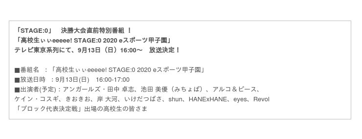 8月29日・30日に開催された「ブロック代表決定戦」から、高校生eスポーツプレイヤーたちの熱戦をご紹介! 9月19日〜22日に開催される決勝大会を目前に、さらなる盛り上がりを見せる「STAGE:0」。特別番組を是非ご覧ください!