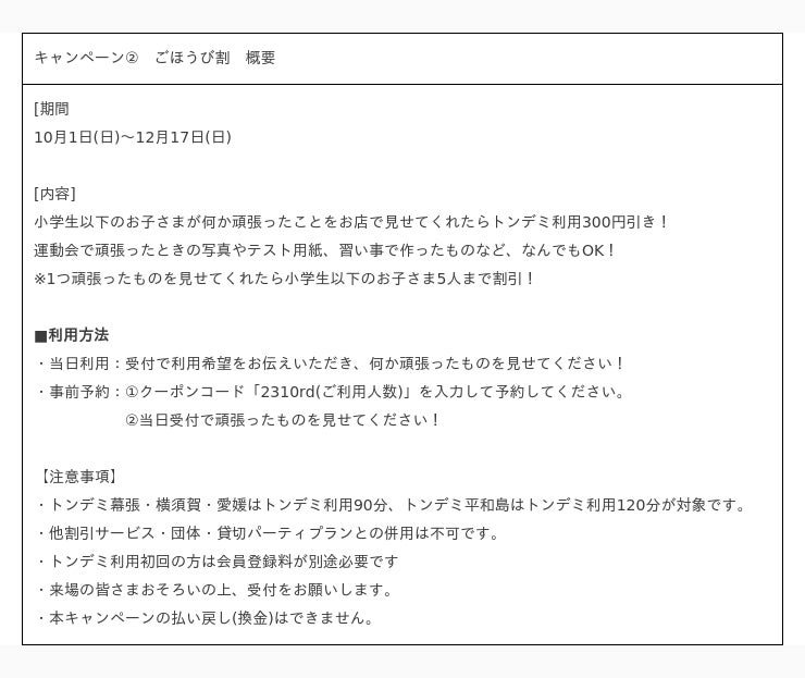 大人から子どもまで、誰でもトンデミ利用5名以上でお得な「スポーツの秋 みんなで運動キャンペーン」と、小学生のお子さまが運動会やテストなどで頑張ったことを見せてくれたらトンデミ利用がお得になる「ごほうび割」の2種のキャンペーンを同時開催!スポーツにぴったりな秋には、トランポリンやクライミングを気軽に楽しめるトンデミで盛り上がろう!