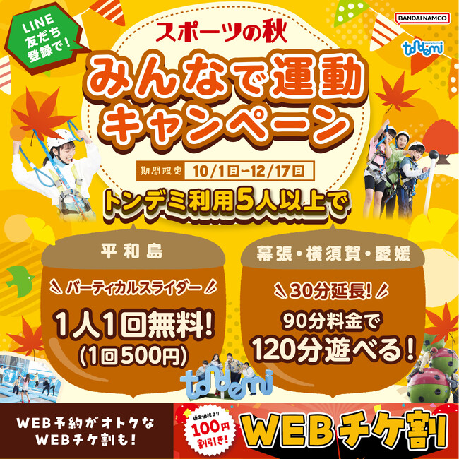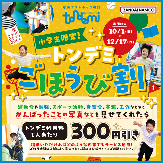 株式会社バンダイナムコアミューズメントは、全国の屋内アスレチック施設『トンデミ』にて、2023年10月1日(日)〜12月17日(日)の期間中、「スポーツの秋 みんなで運動キャンペーン」と、「ごほうび割」の2大キャンペーンを実施します。