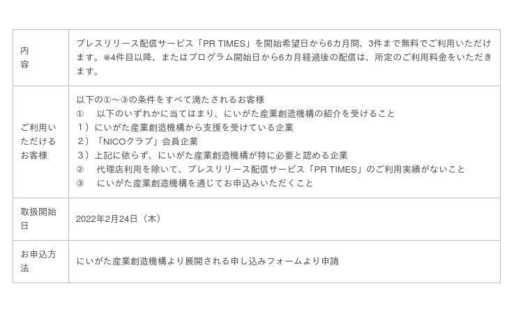 にいがた産業創造機構がプレスリリースを発信する際、「PR TIMES」で無償で提供します。同機構の主催イベントや、新潟県内企業に対する支援メニューなどの情報をプレスリリースによって発信し、支援へのニーズを持つ県内企業に対して迅速に届けられることを期待します。