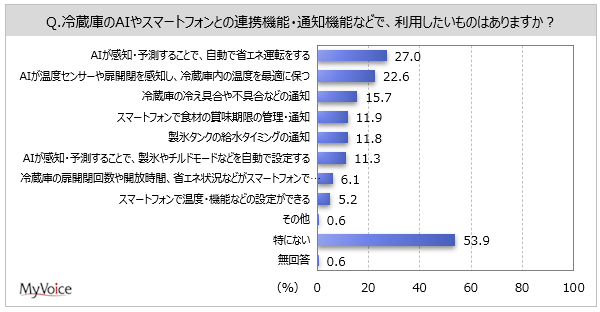 冷蔵庫のAIやスマートフォンとの連携機能で利用したいものは(複数回答)、「AIが感知・予測することで、自動で省エネ運転をする」が27.0%、「AIが温度センサーや扉開閉を感知し、冷蔵庫内の温度を最適に保つ」が22.6%となっています。