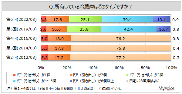 所有している冷蔵庫のタイプは、「ドア(引き出し)が4〜5個」が39.4%、「ドア(引き出し)が3個」が25.1%です。「ドア(引き出し)が2個」は、若年層で比率が高くなっています。