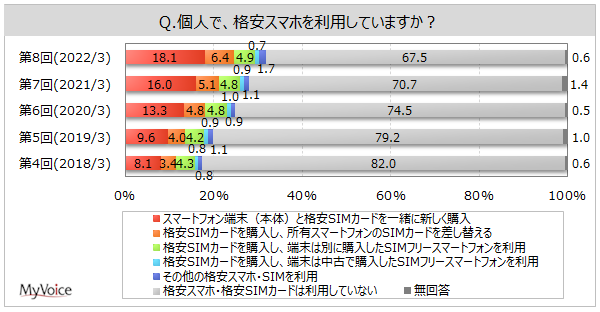 マイボイスコム株式会社(東京都千代田区、代表取締役社長:高井和久)は、インターネット調査を中心に提供している伊藤忠グループのリサーチ会社です。この度、8回目となる『格安スマホ』に関するインターネット調査を2022年3月1日〜5日に実施し、10,100件の回答を集めました。調査結果をお知らせします。