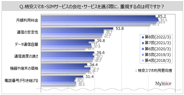 【格安スマホに関する調査】格安スマホ・SIMカード利用者は3割強、利用意向者は4割弱。利用者・意向者ともに増加傾向。利用意向者の重視点は「月額利用料金」が約85%、「通信の安定性」が5割強