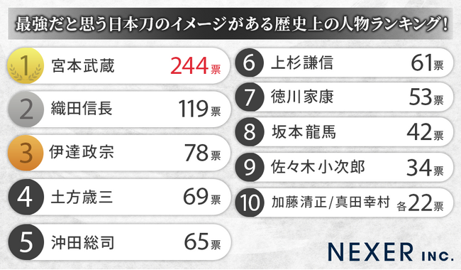 株式会社NEXERは、「永楽堂」と共同で「最強だと思う日本刀のイメージがある歴史上の人物」に関するアンケートを実施し、結果をサイト内にて公開したので紹介します。