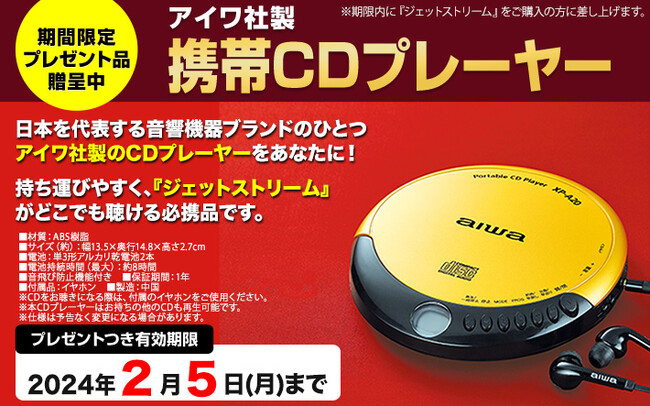 2月5日(月)までのキャンペーン期間中に当社ウェブサイトから本商品をご購入いただくと、期間限定プレゼント「アイワ社製 携帯CDプレーヤー」を贈呈いたします。