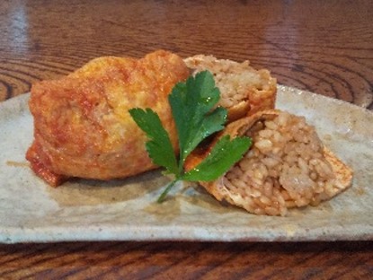 私もお稲荷さんが大好きなのですが、この発想は斬新で食べてみたいなぁと思いました!おにぎりやお弁当に入れたりとどこでも食べられそうな手軽さもいいなぁと思いました!大人から子供まで好きそうな味でトマトジュースで煮詰められた油揚げの味がとっても気になります。(松村 沙友理 特別審査員)