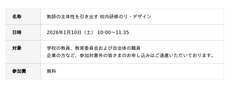 今回は全国の先生方に広く共有するために、どなたでも参加できる公開勉強会とし、2026年1月10日(土)にオンラインで開催いたします。テーマは、教師の主体性を引き出す校内研修です。全校で「自由進度学習」に取り組まれている東京都国分寺市立第四小学校の先生方とともに、授業改善の工夫や、全校で一体となって進めるための校内研修のアイデアを考えます。座談会とトークセッションの二部構成で、第一部のみの聴講も大歓迎です。ぜひご参加ください。