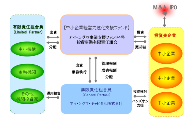 ○「アイ・シグマ事業支援ファンド4号投資事業有限責任組合」は、アイ・シグマ・キャピタル株式会社(代表取締役社長:日野広隆 本社:東京都千代田区)が運営する、事業の承継・再構築を通じた中小企業の成長支援を主な目的とする投資ファンドです。