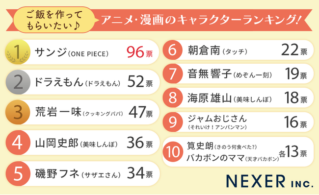 株式会社NEXERは、業務用食材・食品の仕入れ通販、卸売の『八面六臂株式会社』と共同で「ご飯を作ってもらいたいアニメや漫画のキャラ」に関するアンケートを実施し、結果をサイト内にて公開したので紹介します。