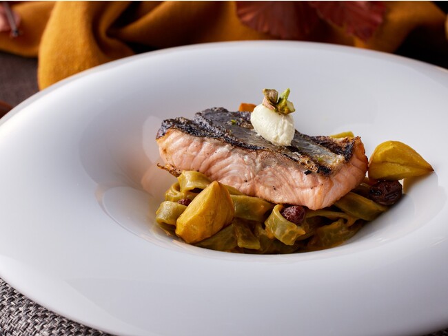秋鮭のグリルとフィットチーネ・栗のフリットを散らして 香り爽やかな柚子胡椒クリームチーズ